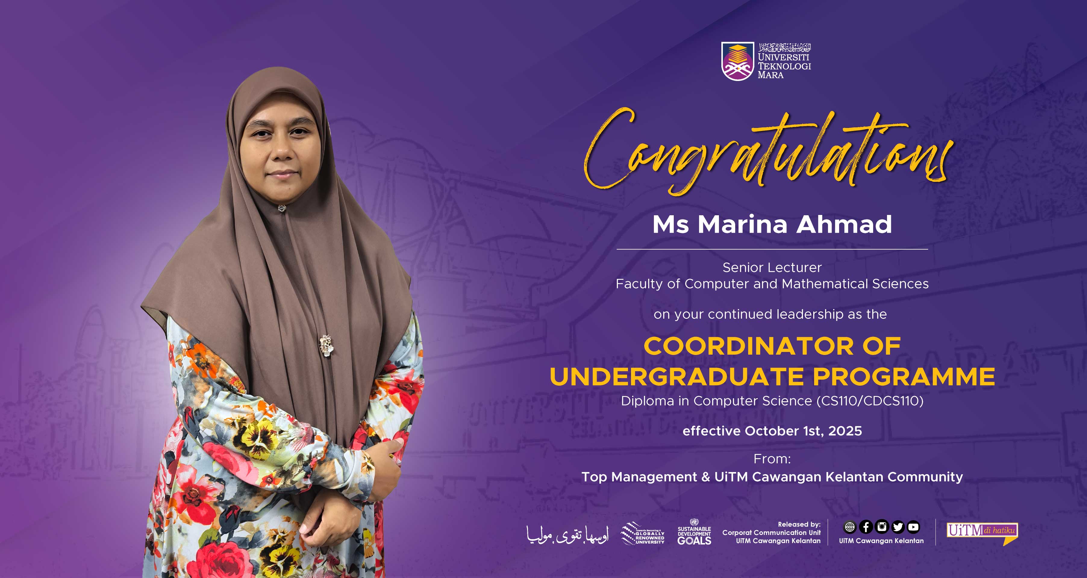 Unit Komunikasi Korporat NEWS Hits: 28 Congratulations!!! Ms Marina Ahmad, Coordinator of Undergraduate Programme, Diploma in Computer Science (CS110/CDCS110)