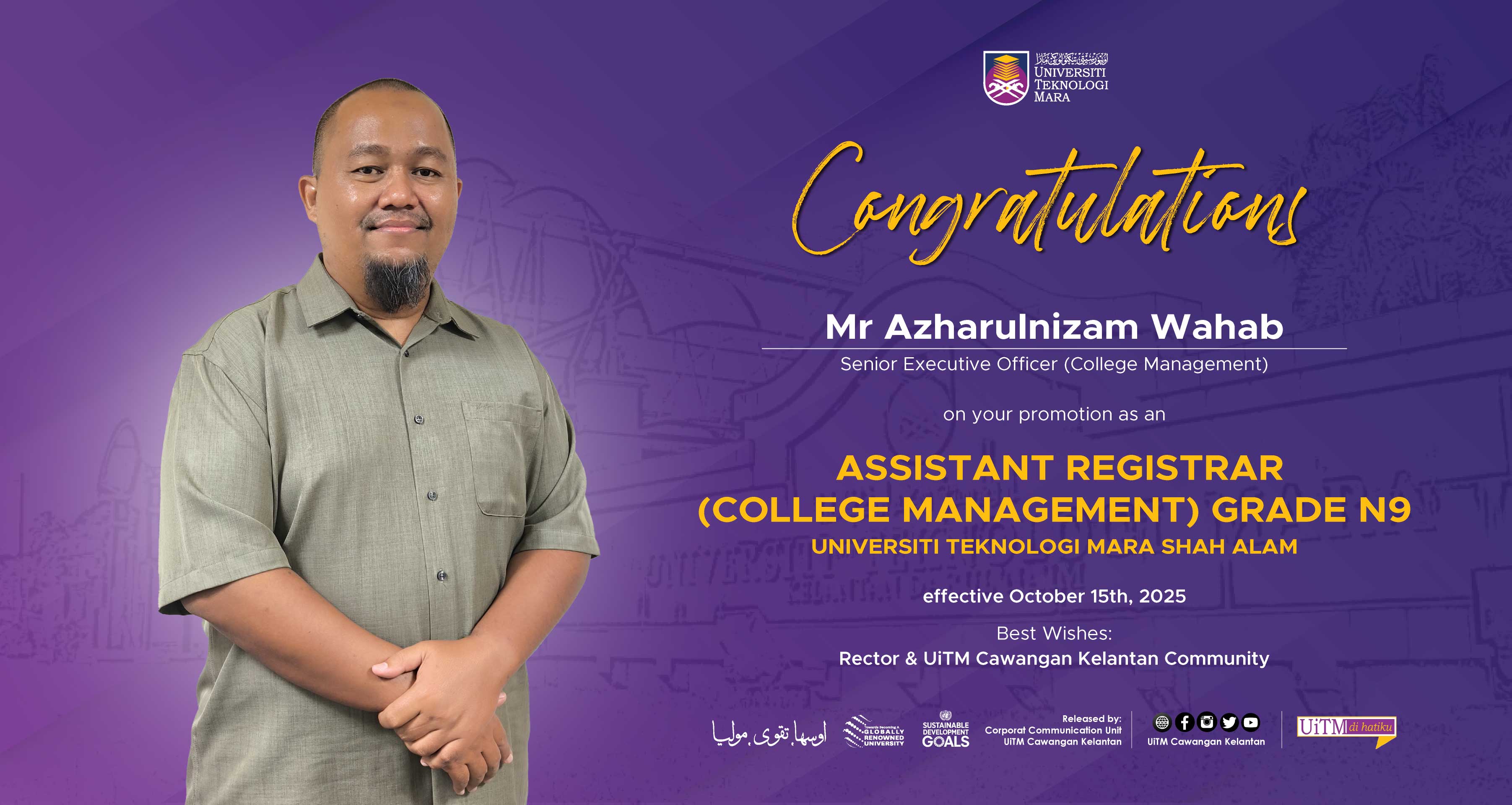 MACHANG, 15 October - Congratulations and All the Best Mr Azharulnizam Wahab on his promotion as an Assistant Registrar (College Management) Grade N9 at Universiti Teknologi MARA Shah Alam effective October 15th, 2025.