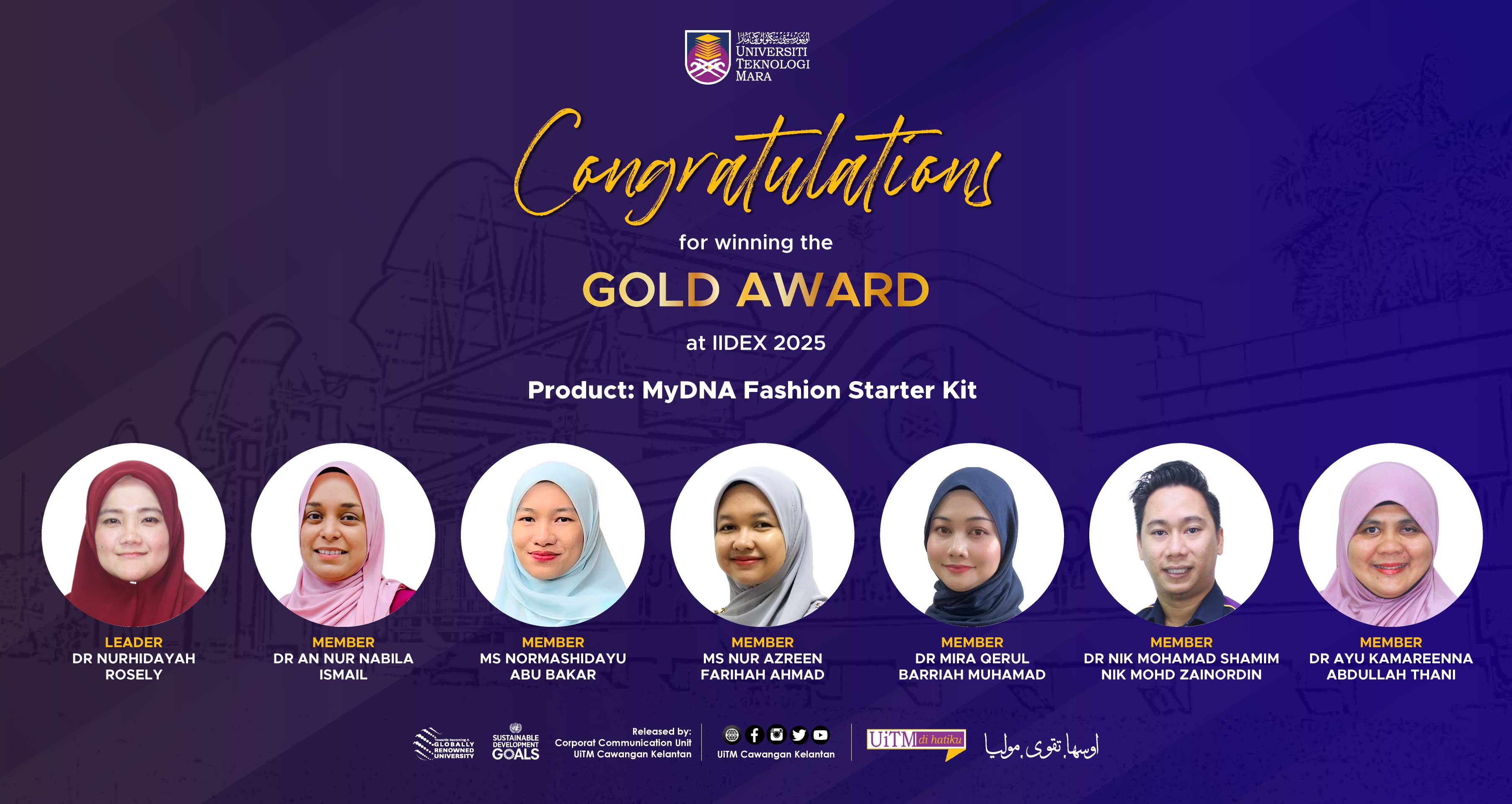 MACHANG, 4 November - Congratulations Dr Nurhidayah Rosely and team members for winning the Gold Award at IIDEX 2025 with their innovative product MyDNA Fashion Starter Kit.