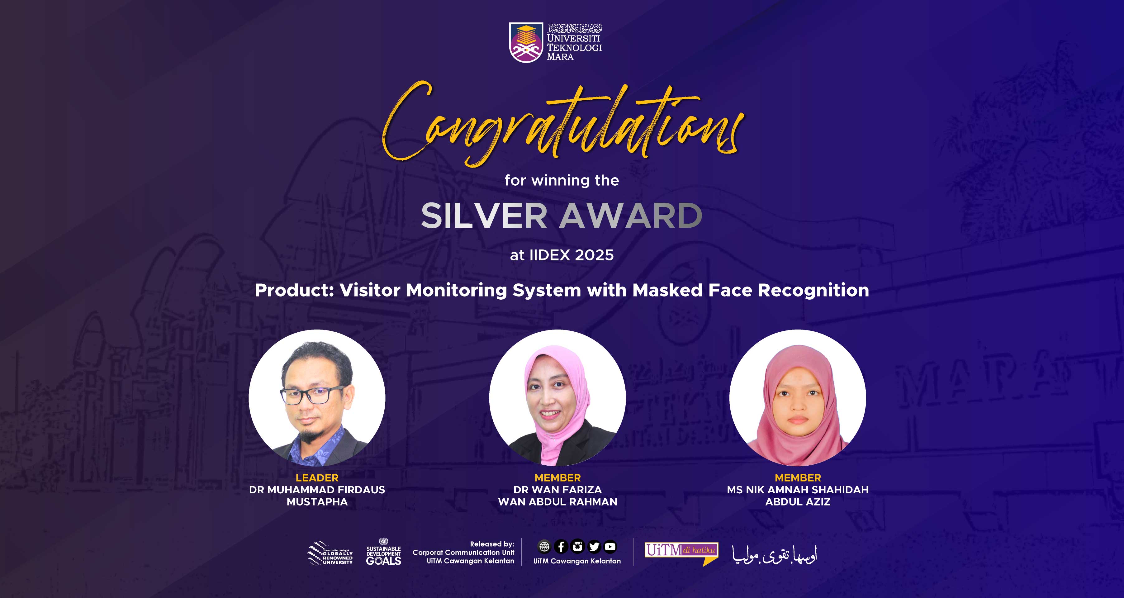 MACHANG, 4 November - Congratulations Dr Muhammad Firdaus Mustapha and team members for winning the Silver Award at IIDEX 2025 with their innovative product Visitor Monitoring System with Masked Face Recognition.