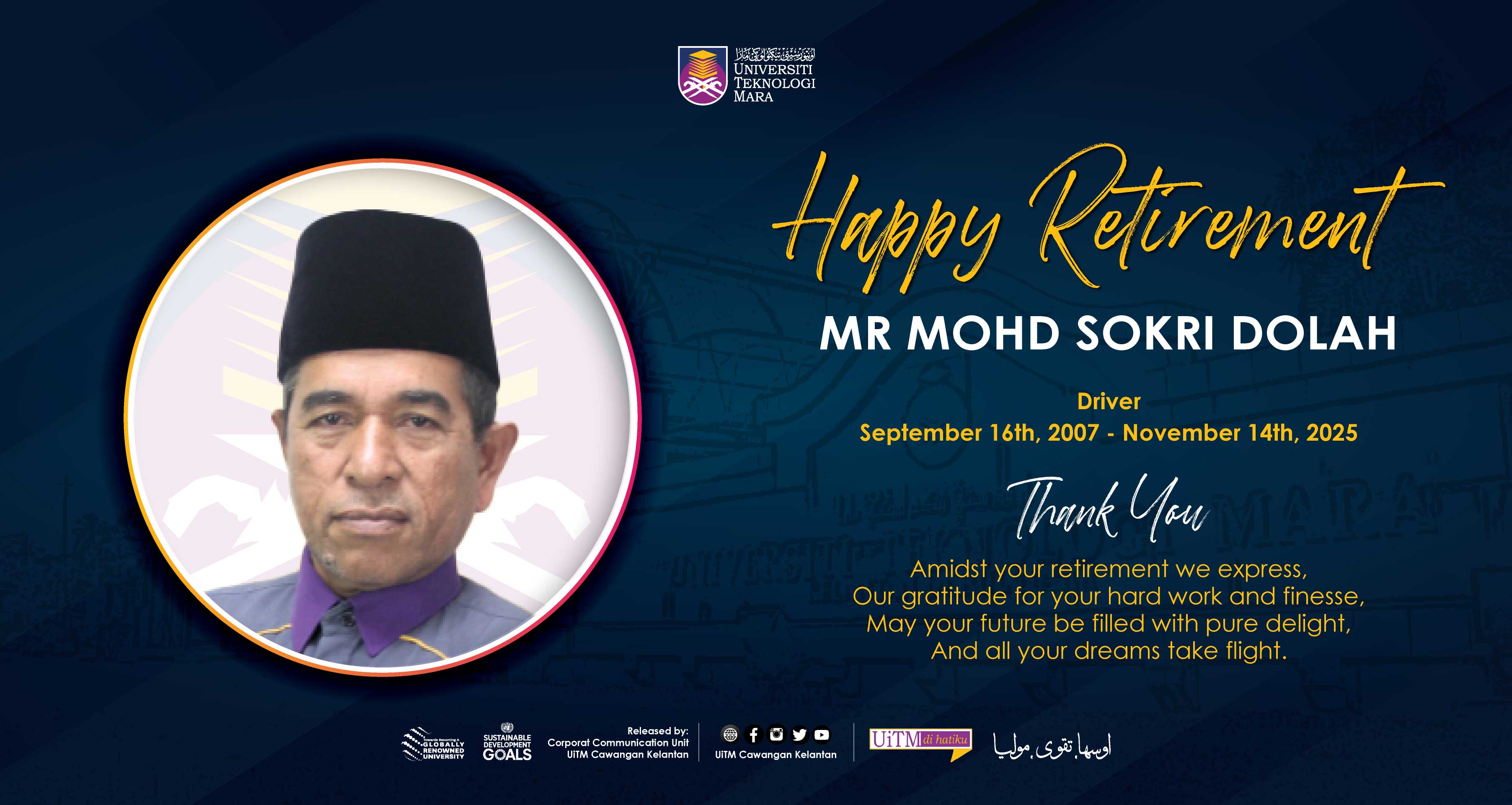 Unit Komunikasi Korporat NEWS Hits: 46 Happy Retirement, Mr Mohd Sokri Dolah MACHANG, 16 November - Happy retirement and thank you to Mr Mohd Sokri Dolah for your hard work and finesse. Previous article: Congratulations!!! Dr Nur Hazelen Mat Rusok, Coordinator of Malaysian Academy of SME & Entrepreneurship Development (MASMED) Prev Next article: Congratulations!!! Ms Siti Noor Azmawaty Abd Razak, Liaison Officer (LO) BITCOM Next