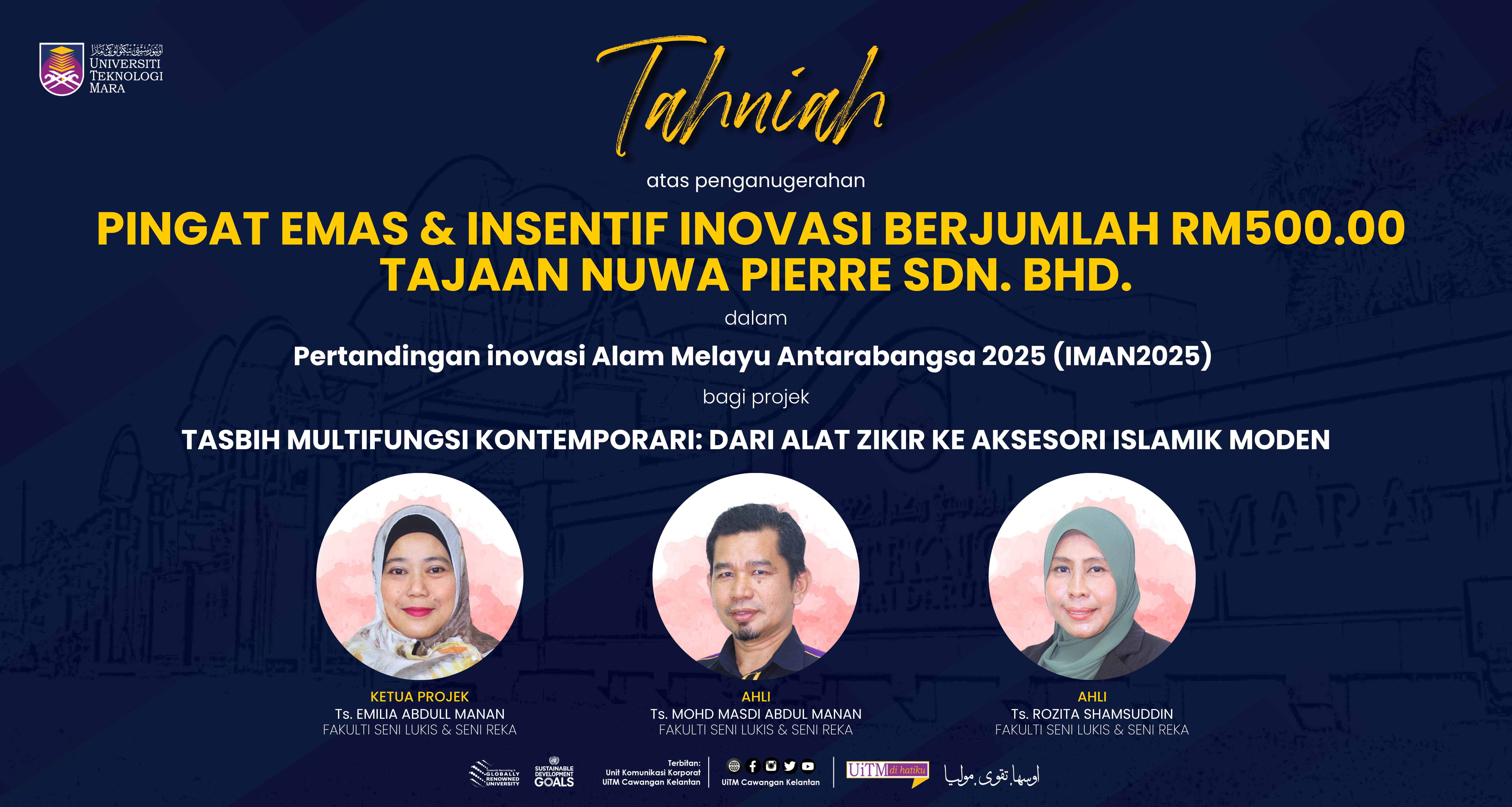 MACHANG, 18 November - Tahniah diucapkan kepada Ts. Emilia Abdull Manan, Ts. Mohd Masdi Abdul Manan dan Ts. Rozita Shamsuddin atas penganugerahan Pingat Emas serta Insentif Inovasi berjumlah RM500.00 tajaan Nuwa Pierre Sdn. Bhd. dalam Pertandingan Inovasi Alam Melayu Antarabangsa 2025 (IMAN2025) bagi projek Tasbih Multifungsi Kontemporari: Dari Alat Zikir ke Aksesori Islamik Moden.