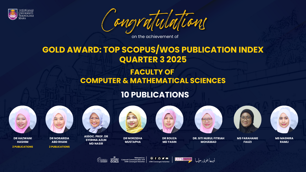 MACHANG, 24 November – Congratulations to Dr Hazwani Hashim, Dr Norarida Abd Rhani, Assoc. Prof. Dr Syerina Azlin Md Nasir, Dr Norzieha Mustapha, Dr Roliza Md Yasin, Dr Siti Nurul Fitriah, Ms Farahanie Fauzi and Ms Masnira Ramli from the Faculty of Computer & Mathematical Sciences on achieving the Gold Award: Top SCOPUS/WOS Publication Index for Quarter 3, 2025 with a total of 10 publications.