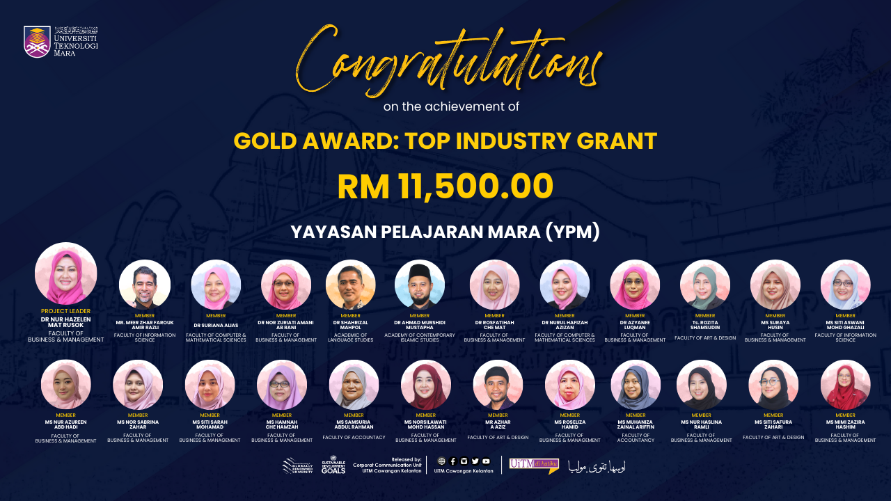MACHANG, 24 November - Congratulations to Dr Hazelen Mat Rusok and team members on achieving the Gold Award: Top Industry Grant RM11,500.00 from Yayasan Pelajaran MARA (YPM).