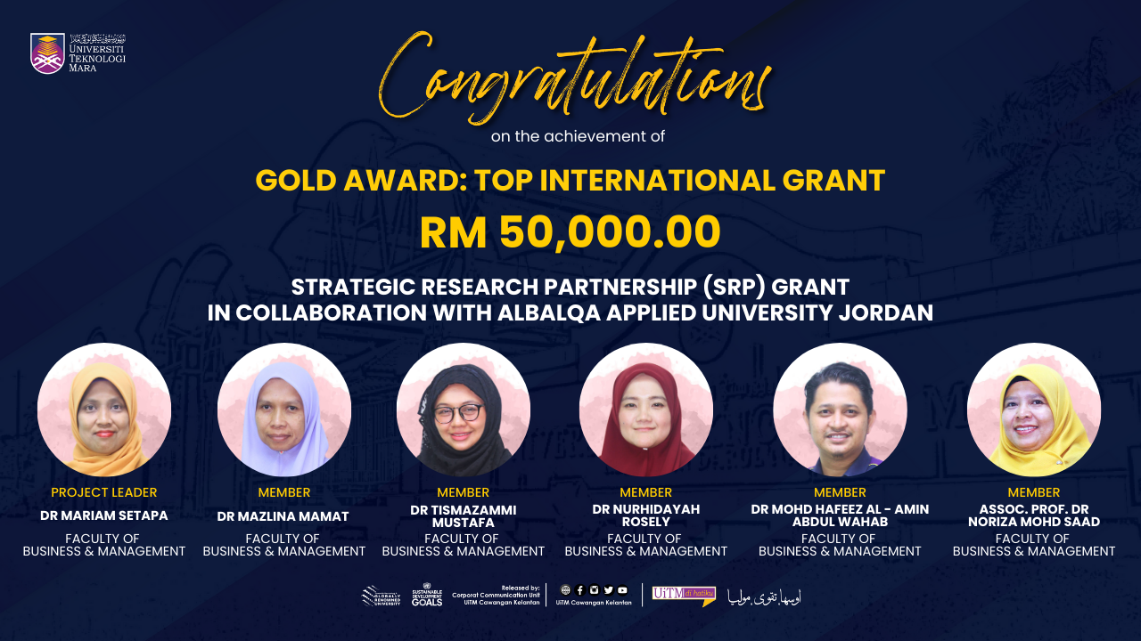 MACHANG, 24 November - Congratulations to Dr Mariam Setapa and team members on achieving the Gold Award: Top International Grant RM50,000.00 for the Strategic Research Partnership (SRP) Grant in Collaboration with AlBalqa Applied University Jordan.