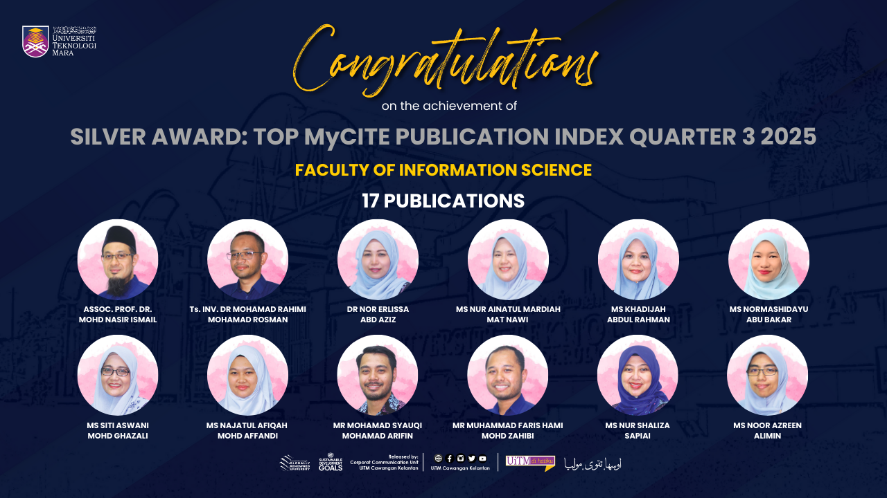 MACHANG, 26 November – Congratulations to Assoc Prof. Dr Mohd Nasir Ismail, Ts. Inv. Dr Mohamad Rahimi, Dr Nor Erlissa Abd Aziz, Ms Nur Ainatul Mardiah Mat Nawi, Ms Khadijah Abdul Rahman, Ms Normashidayu Abu Bakar, Ms Siti Aswani Mohd Ghazali, Ms Najatul Afiqah Mohd Affandi, Mr Mohamad Syauqi Mohamad Arifin, Mr Muhammad Faris Hami Mohd Zahibi, Ms Nur Shaliza Sapiai and Ms Noor Azreen Alimin from the Faculty of Information Science on achieving the Gold Award: Top MyCite Publication Index for Quarter 3, 2025 with a total of 17 publications.