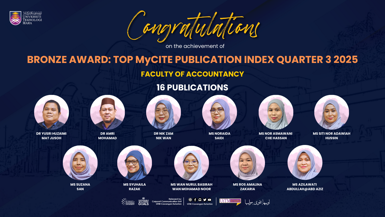 MACHANG, 26 November – Congratulations to Dr Yusri Huzaimi Mat Jusoh, Dr Amri Mohamad, Dr Nik Zam Nik Wan, Ms Noraida Saidi, Ms Nor Asmawani Che Hassan, Ms Siti Nor Adawiah Hussin, Ms Suzana San, Ms Syuhaila Razak, Ms Wan Nurul Basirah Wan Mohamad Noor, Ms Ros Amalina Zakaria and Ms Azilawati Abdullah@Abd Aziz from the Faculty of Accountancy on achieving the Bronze Award: Top MyCite Publication Index for Quarter 3, 2025 with a total of 16 publications.