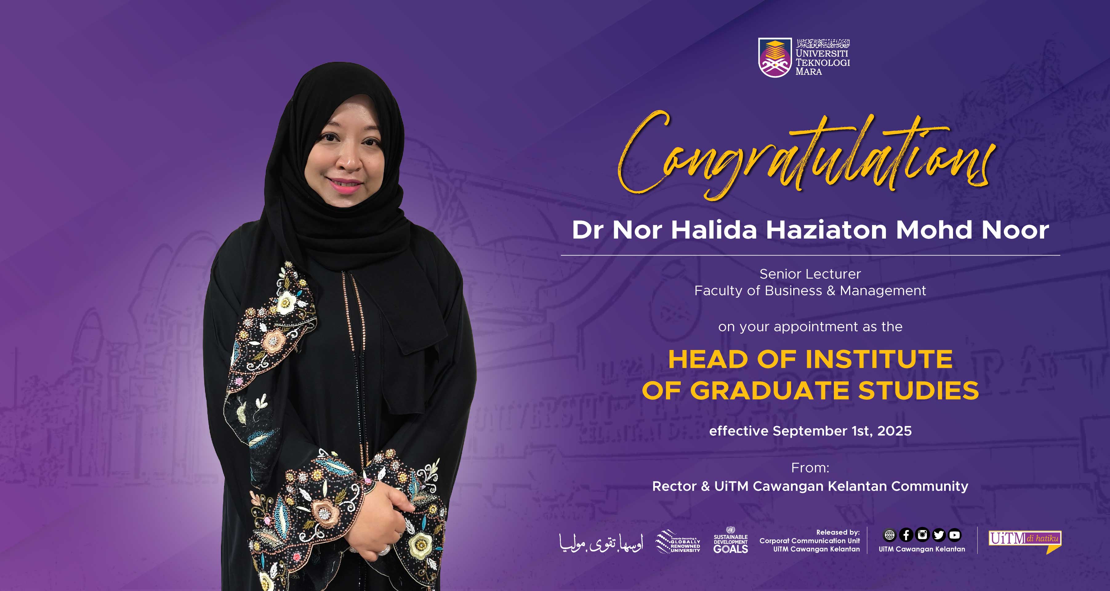 Unit Komunikasi Korporat NEWS Hits: 172 Congratulations!!! Dr Nor Halida Haziaton Mohd Noor, Head of Institute of Graduate Studies