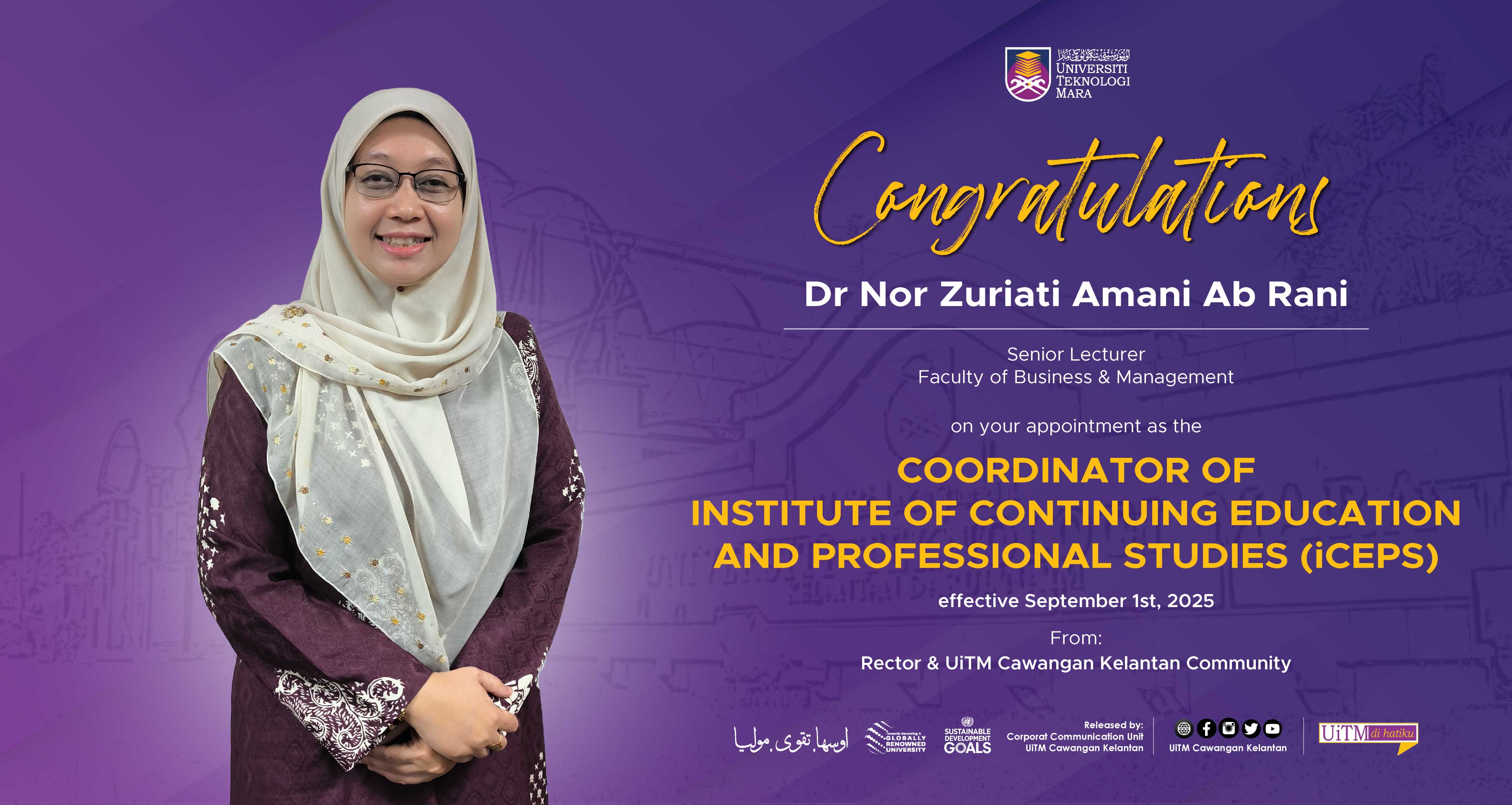 Unit Komunikasi Korporat NEWS Hits: 150 Congratulations!!! Dr Nor Zuriati Amani Ab Rani, Coordinator of Institute of Continuing Education and Professional Studies (iCEPS)