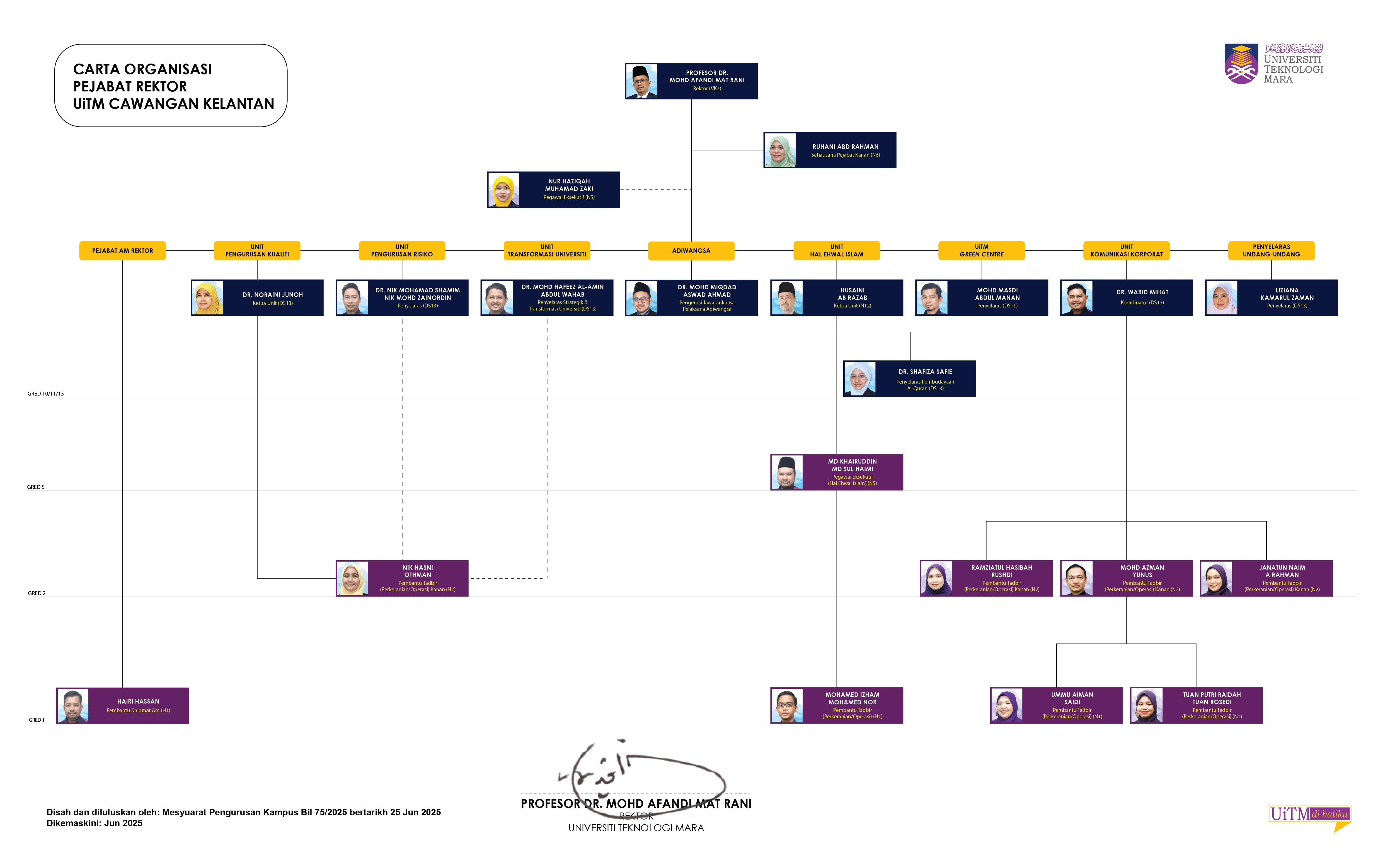 Located at level 2, Administration Building of UiTMCK, Rector Office was established in July 1985 and it was first known as Provost Office. This unit is headed by Rector, Executive Officer, Office Secretary, Clerk and Operational Assistant.