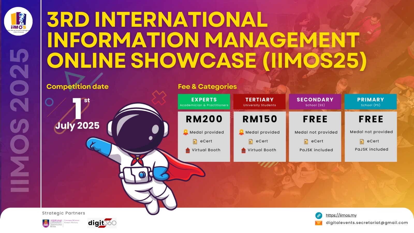 It is with great pleasure that we extend to you an exclusive invitation to participate in the highly anticipated 3rd International Information Management Online Showcase (IIMOS 2025), proudly organized by the Faculty of Information Science, Universiti Teknologi MARA, Kelantan Branch.