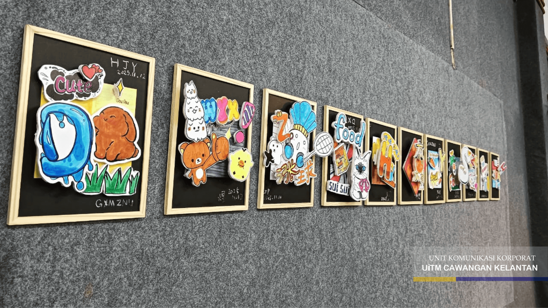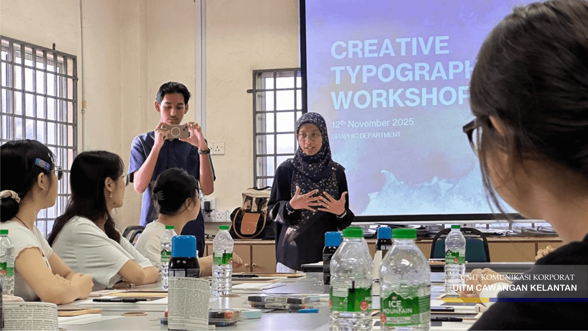 MACHANG, 16 November - Creative Typography Workshop yang dikelolakan oleh Jabatan Seni Reka Grafik & Media Digital, berlangsung di Blok C, Fakulti Seni Lukis Dan Seni Reka pada 12 November 2025 telah berlangsung dengan jayanya. Program ini merupakan salah satu pengisian akademik yang dianjurkan oleh Jabatan Seni Reka Grafik & Media Digital dengan objektif untuk meningkatkan kemahiran pelajar dalam meneroka tipografi kreatif serta mengaplikasikan elemen tipografi dalam bentuk instalasi tiga dimensi.