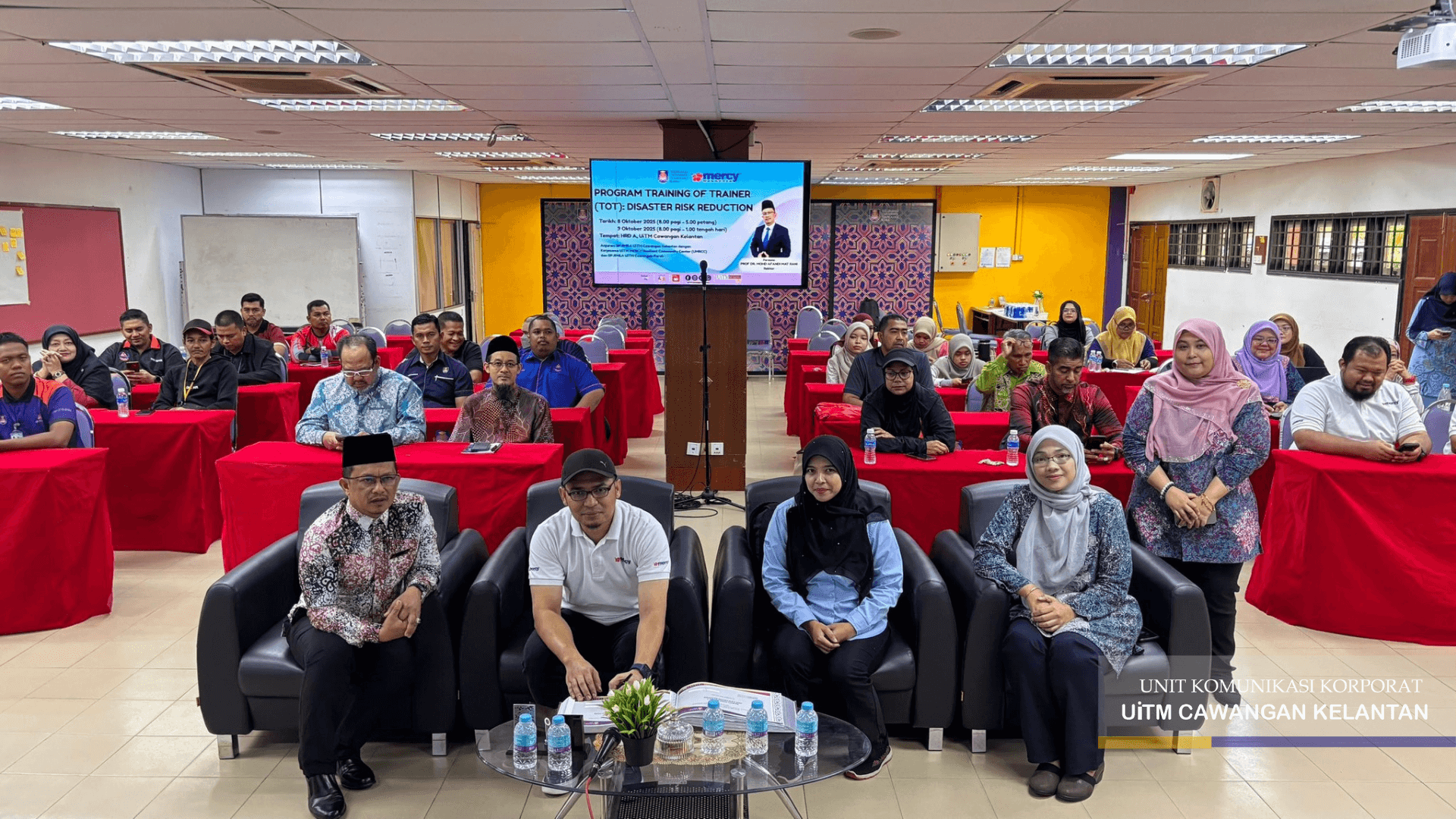 MACHANG, 27 November - Program Training of Trainer: Disaster Risk Reduction telah berlangsung pada 8 dan 9 Oktober 2025 bertempat di HRD A, UiTM Cawangan Kelantan. Program ini dianjurkan oleh Bahagian Penyelidikan, Jaringan Industri, Masyarakat dan Alumni (BPJIM&A) dengan kerjasama UiTM MERCY Resilient Community Center (UMRCC) UiTM Cawangan Perak serta MERCY Malaysia. Penganjuran ini menghimpunkan peserta daripada pelbagai latar belakang bagi memperkukuh ilmu dan kompetensi dalam pengurangan risiko bencana serta pengurusan kecemasan komuniti.